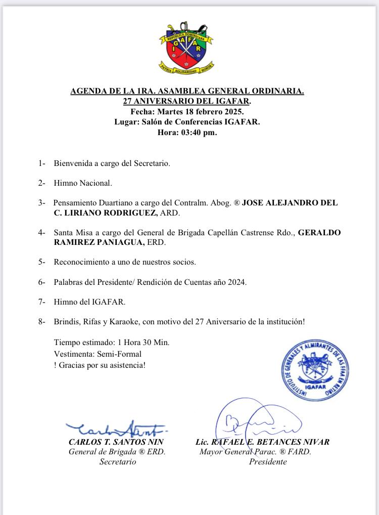 Agenda de la 1ra. Asamblea general ordinaria. De nuestro 27 aniversario del IGAFAR. 5 de febrero de 2025 La cual de celebrara el martes 18 de febrero del 2025 en el Salón de conferencias IGAFAR a las 03:40 PM. Contamos con su asistencia y apoyo.